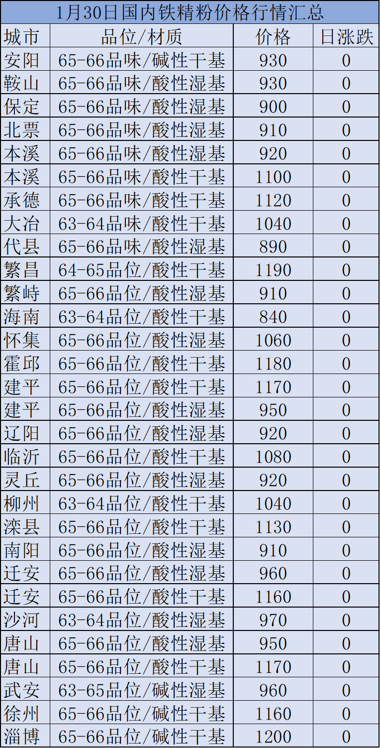1月30日國內(nèi)鐵精粉行情匯總